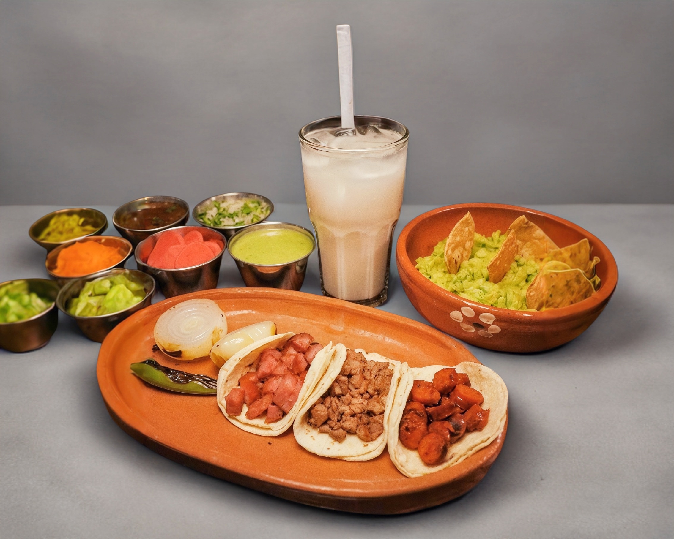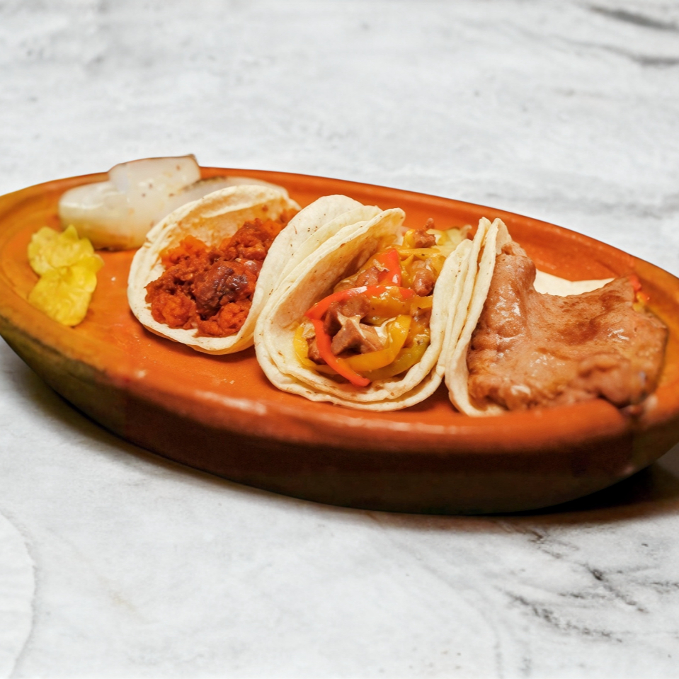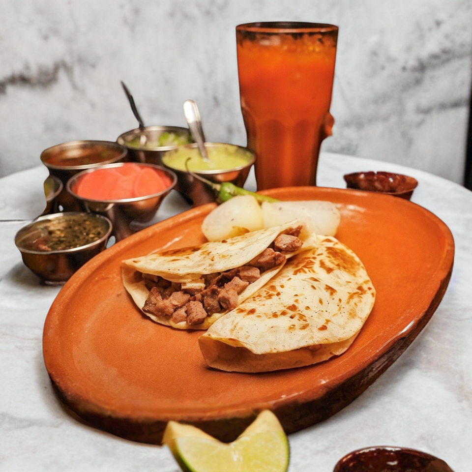 Filete de sirloin , chistorra, chorizo tradicional, chorizo argentino, quesadilla sencilla, tortillas de maíz, chile toreado, cebolla azada, y frijoles charros