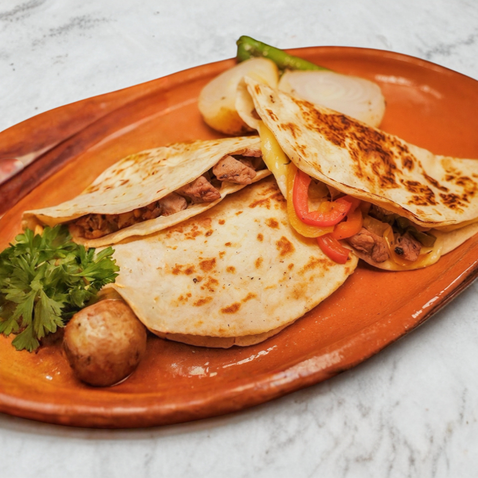 Tortilla de harina, queso gouda, chile morrón, cebolla y carne de sirloin