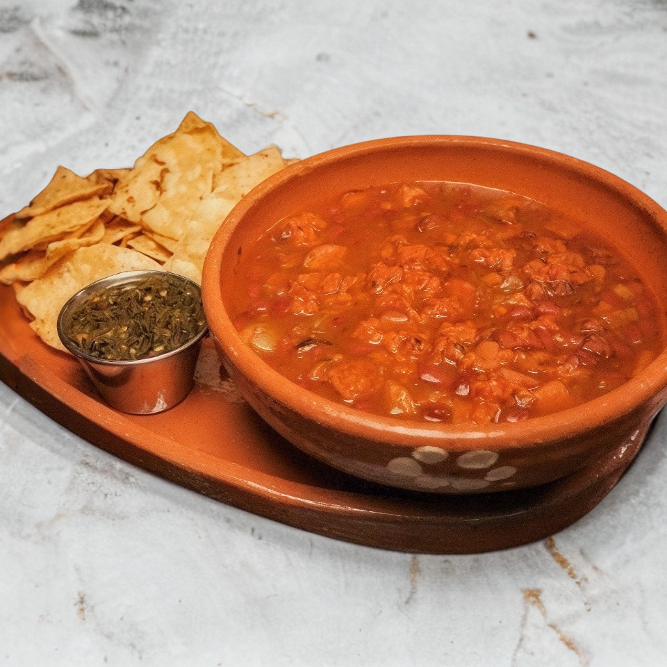 Frijoles, chorizó tradicional, salchicha, tocino, cebolla, cilantro, tomate, acompañado de totopos
