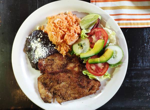 Acompañado de ensalada, espagueti y frijol.