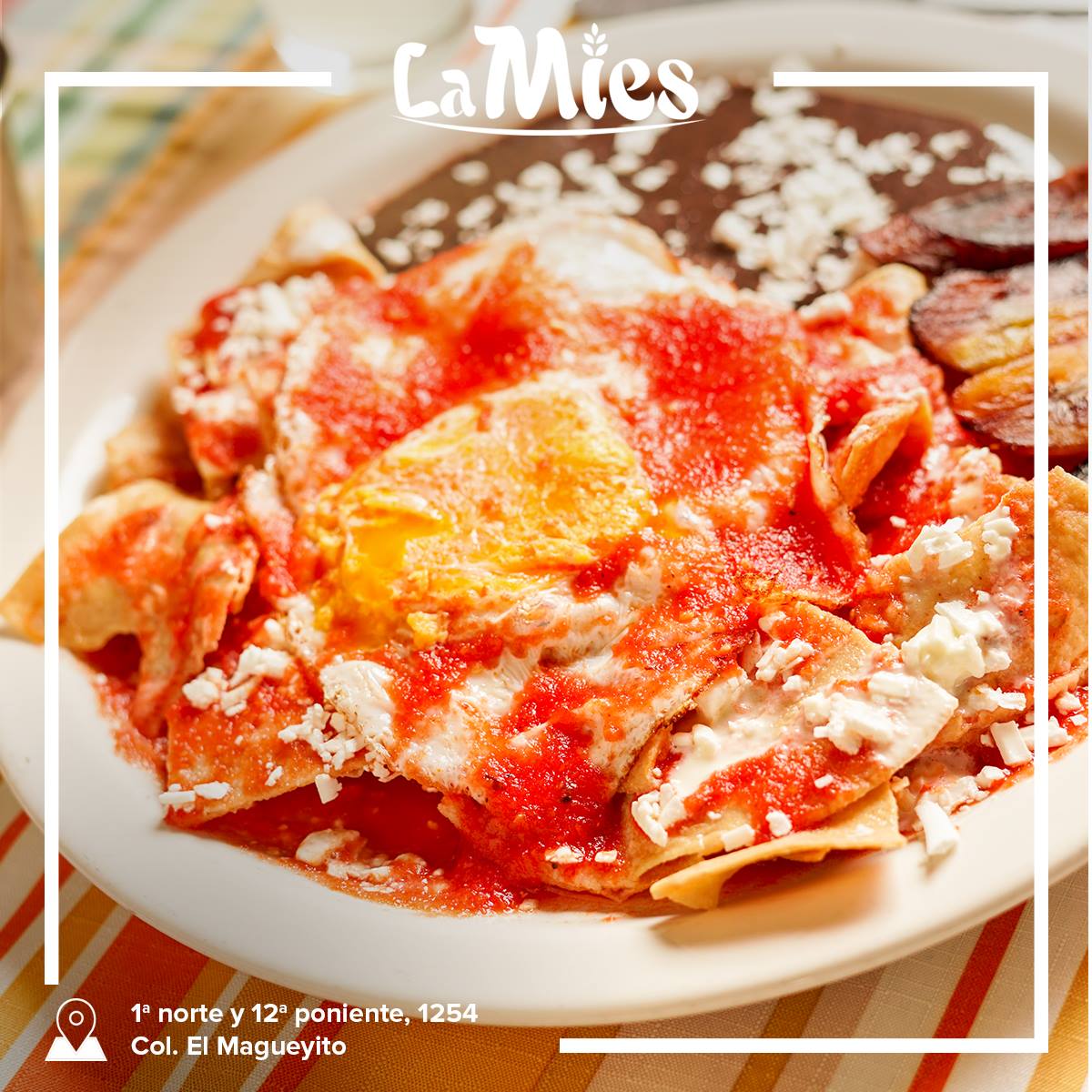 Tortilla frita con pollo, bañado en salsa roja o verde, crema y queso y plátanos fritos.