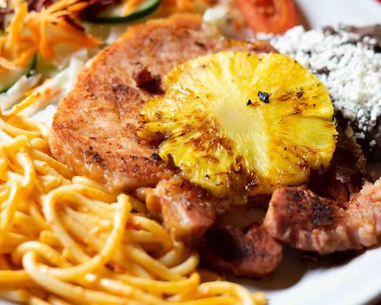 Chuleta de cerdo ahumada, acompañada de ensalada, espagueti y frijol, puede incluir agua o sopa del día.