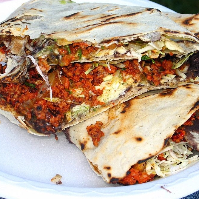 Tortilla de maíz, manteca, frijoles, quesillo y repollo