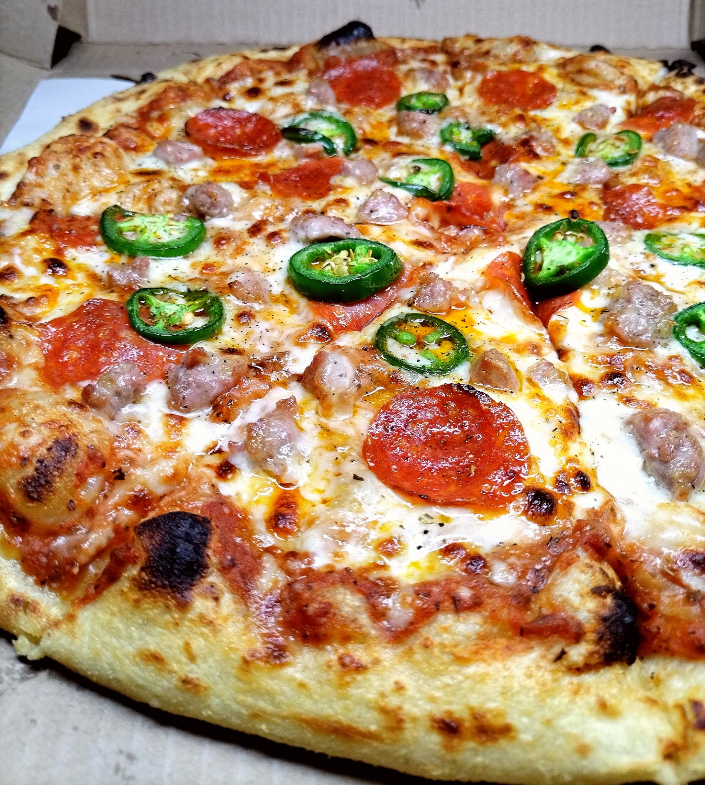 Salsa pomodoro, queso mozzarella, pepperoni, chorizo argentino y jalapeños frescos.