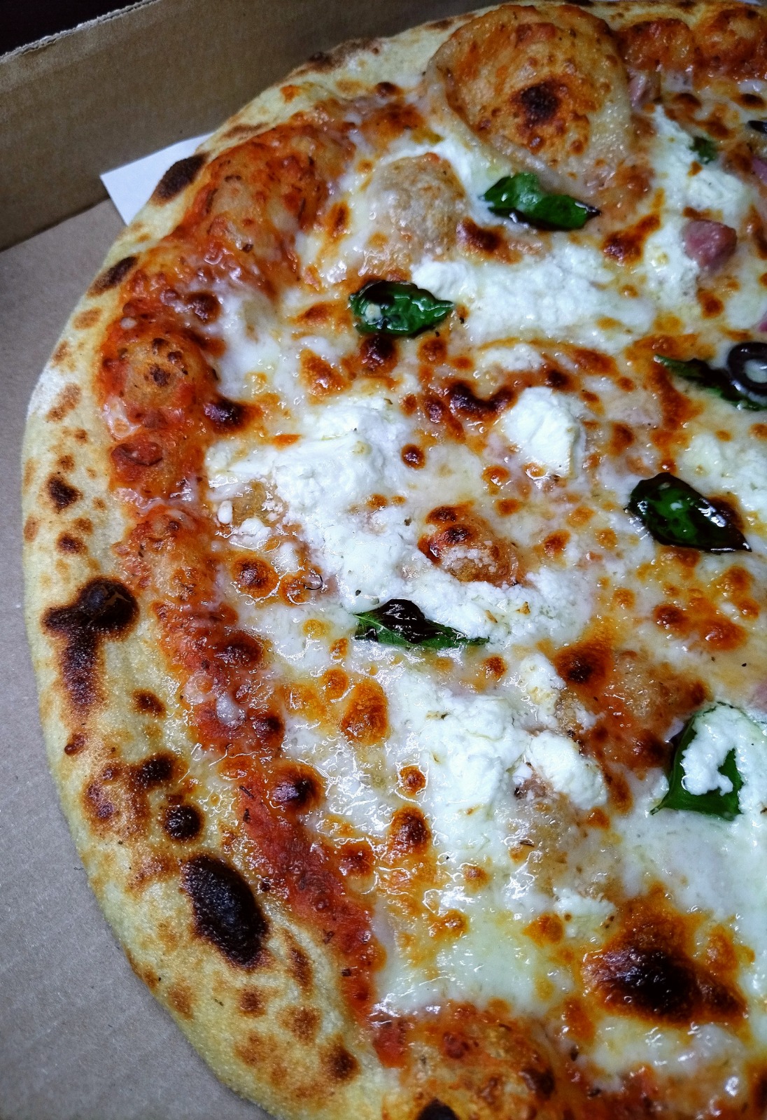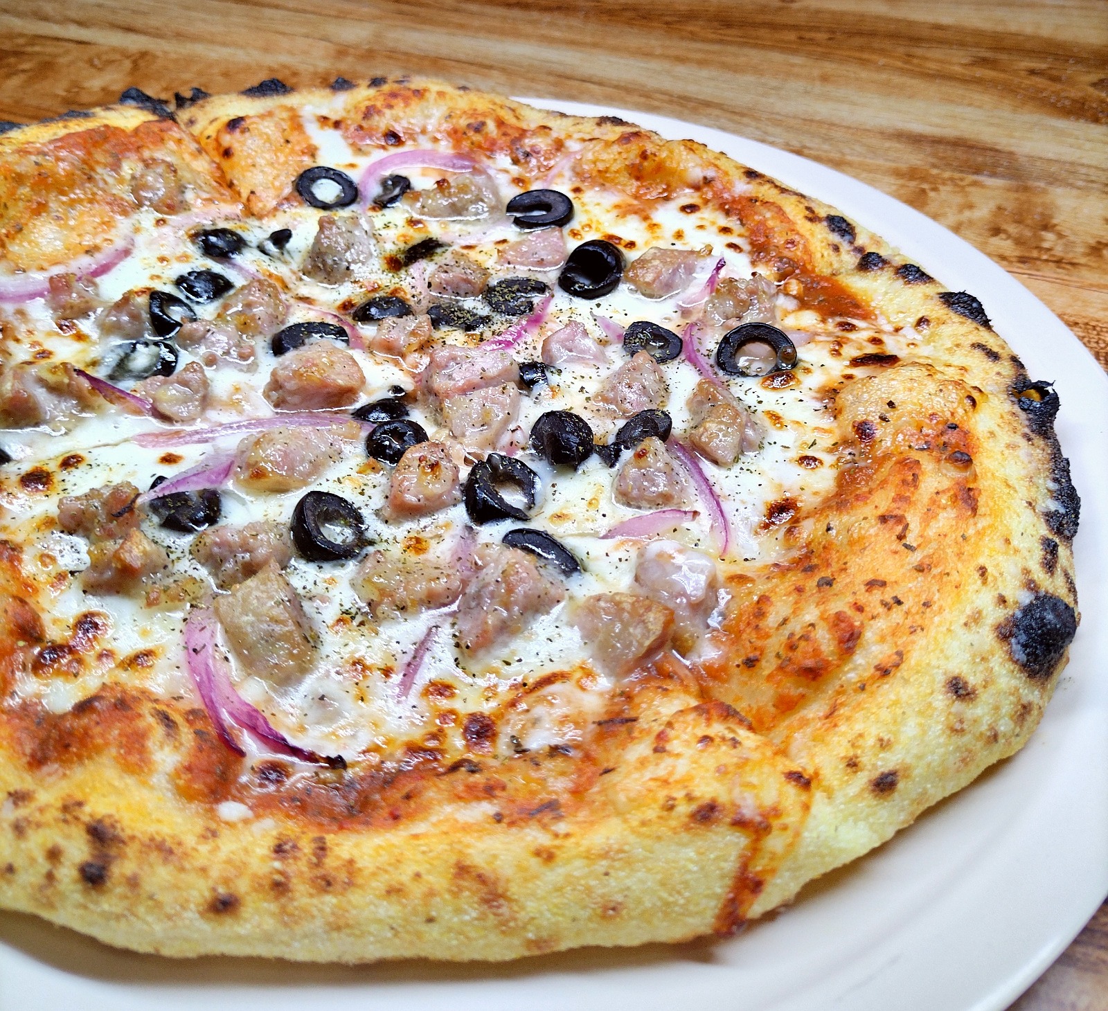 Salsa pomodoro, queso mozzarella, cebolla morada, chorizo argentino y aceitunas negras.