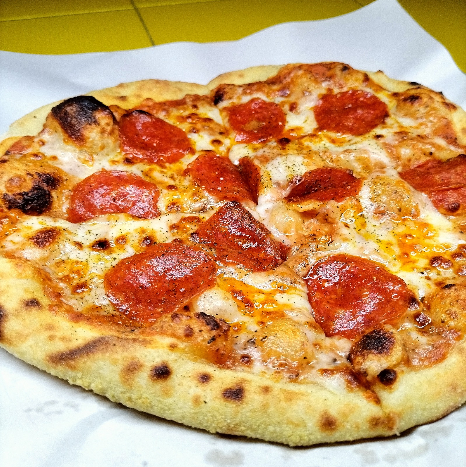 Salsa pomodoro, queso mozzarella, salami, pepperoni y jamon.