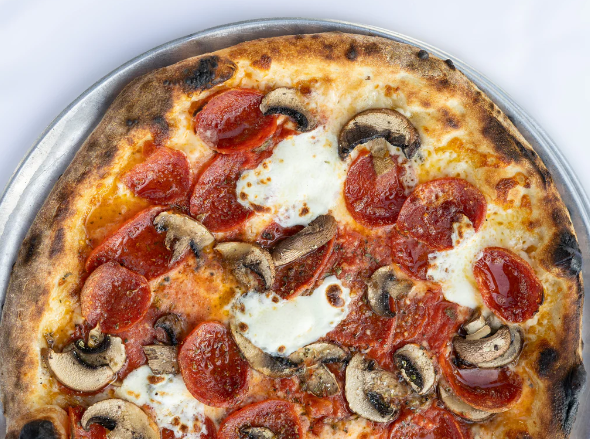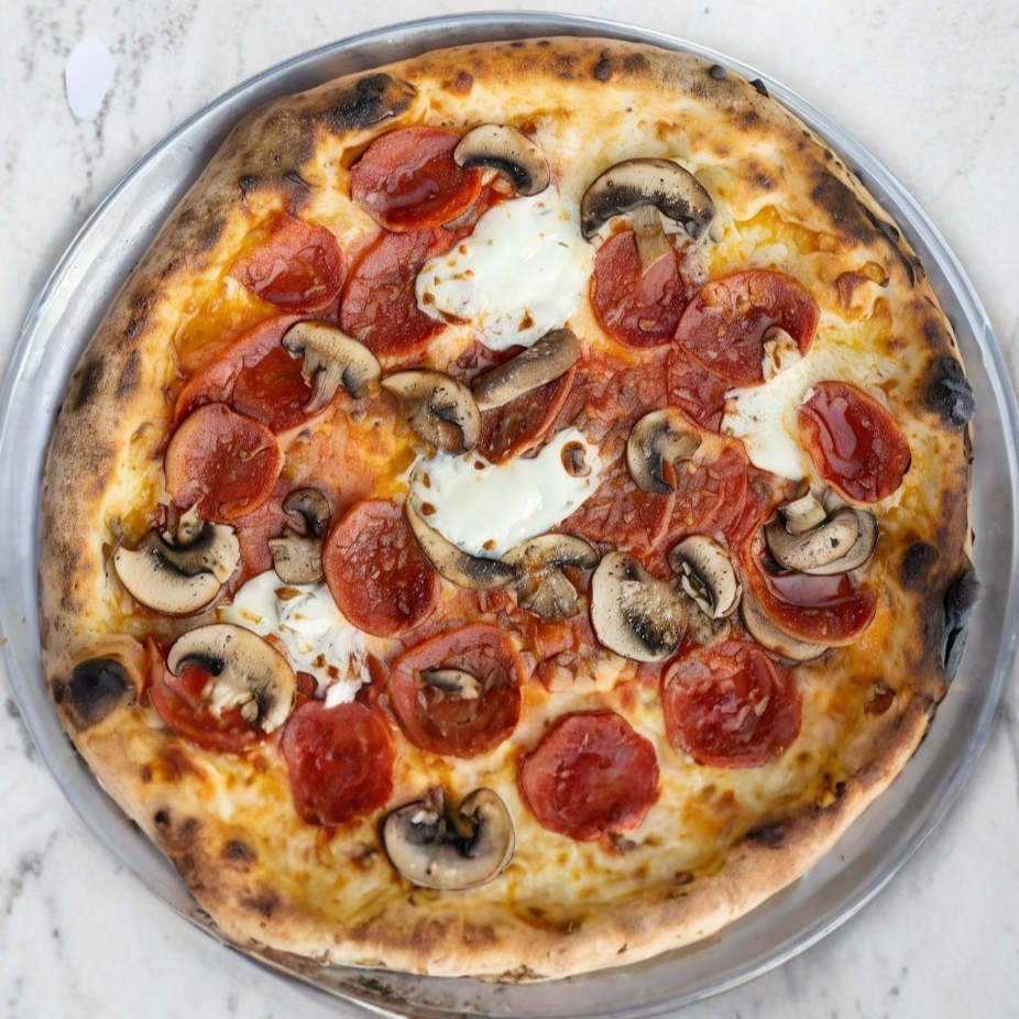 Salsa pomodoro, queso mozzarella, pepperoni y champiñones frescos.