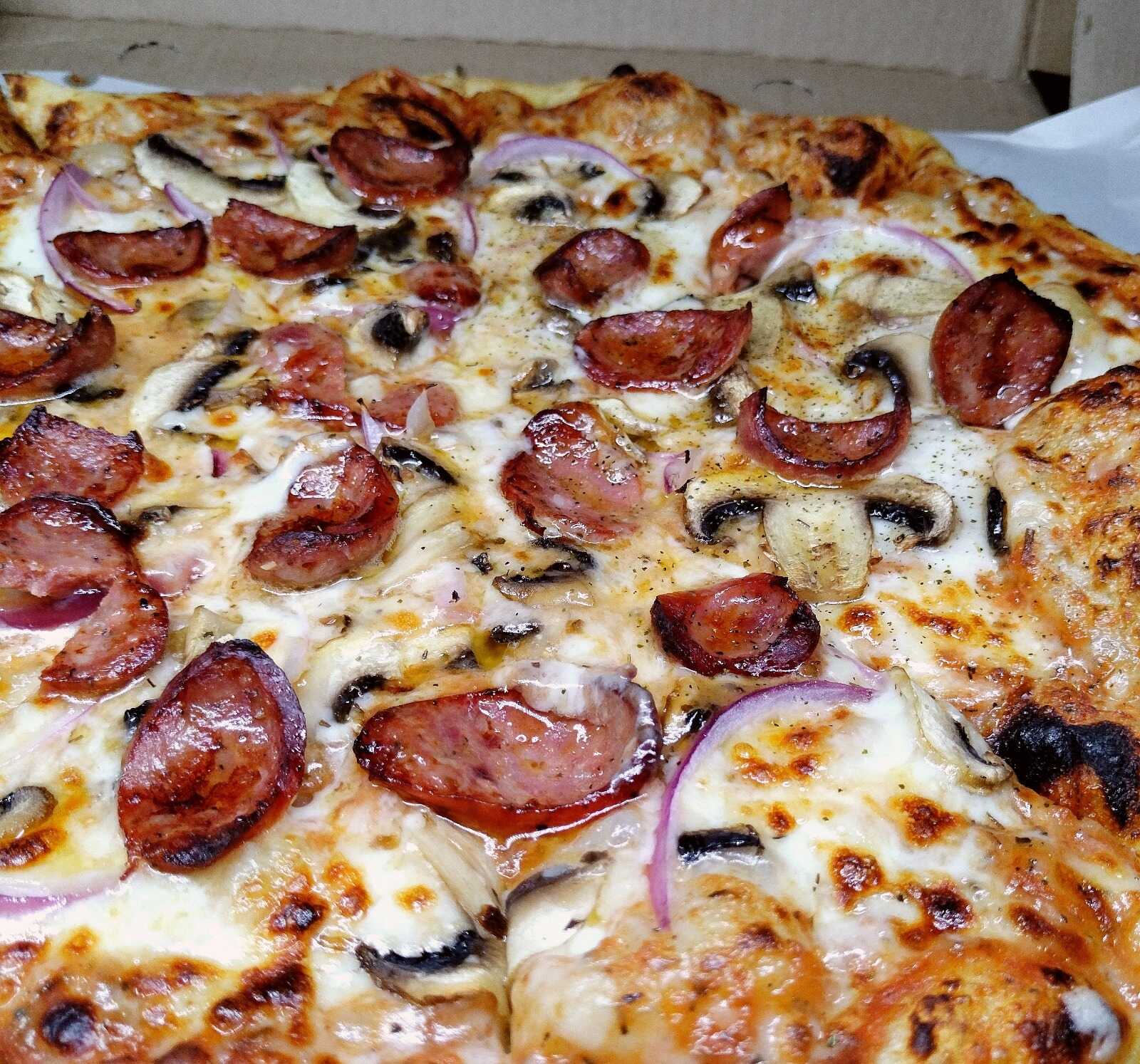 Pizza de 4 rebanadas con salsa pomodoro, queso mozzarella, cebolla morada, salchicha de res ahumada y champiñones frescos.