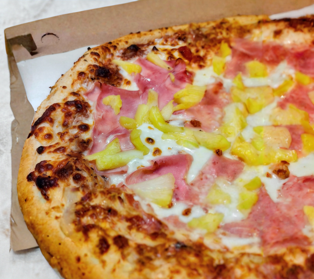 Salsa pomodoro, queso mozzarella, jamón, piña y champiñones frescos.