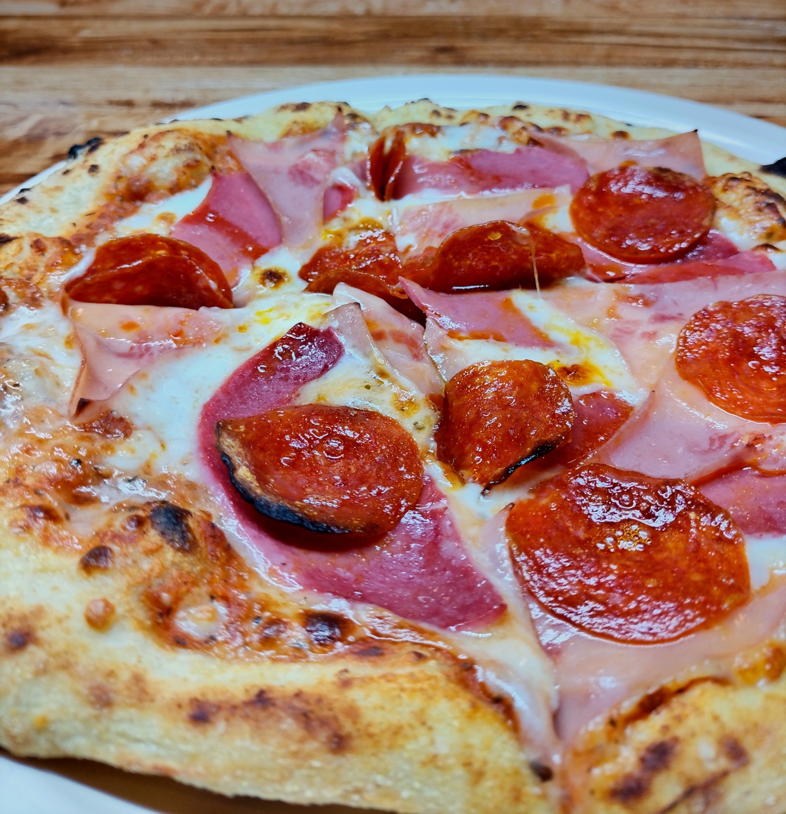 Salsa pomodoro, queso mozzarella, salami, jamón y pepperoni.