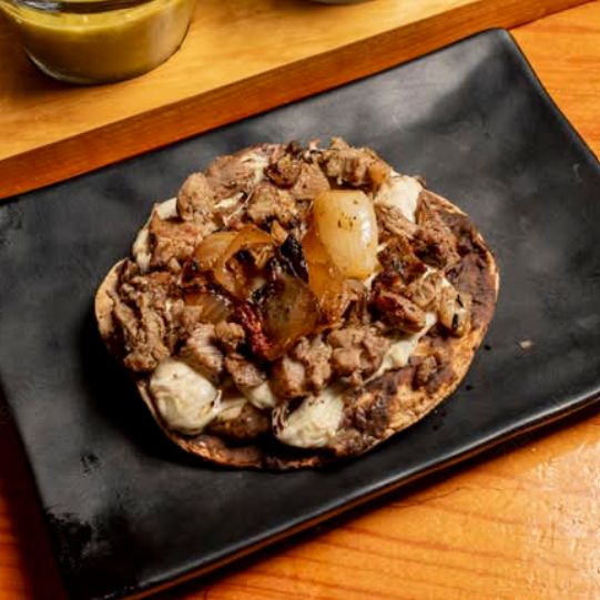 Tortilla dorada con queso y carne a elegir: churrasco, asada, costilla, chorizo, longaniza y campechano.