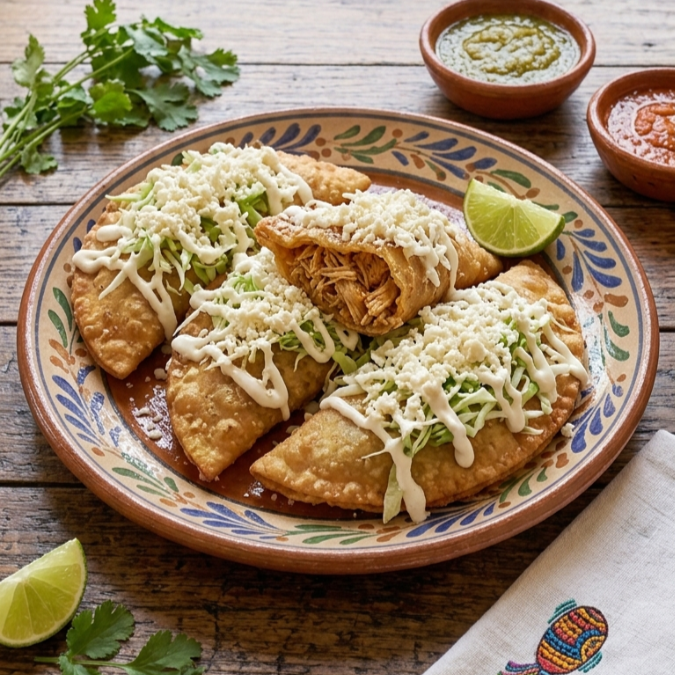 Cinco empanadas de masa de maíz nixtamalizado, doraditas y crujientes, rellenas de un jugoso pollo deshebrado sazonado con nuestro recaudo especial de la casa (tomate, especias y ese sazón único de Chiapas). Acompañadas de queso y salsa.