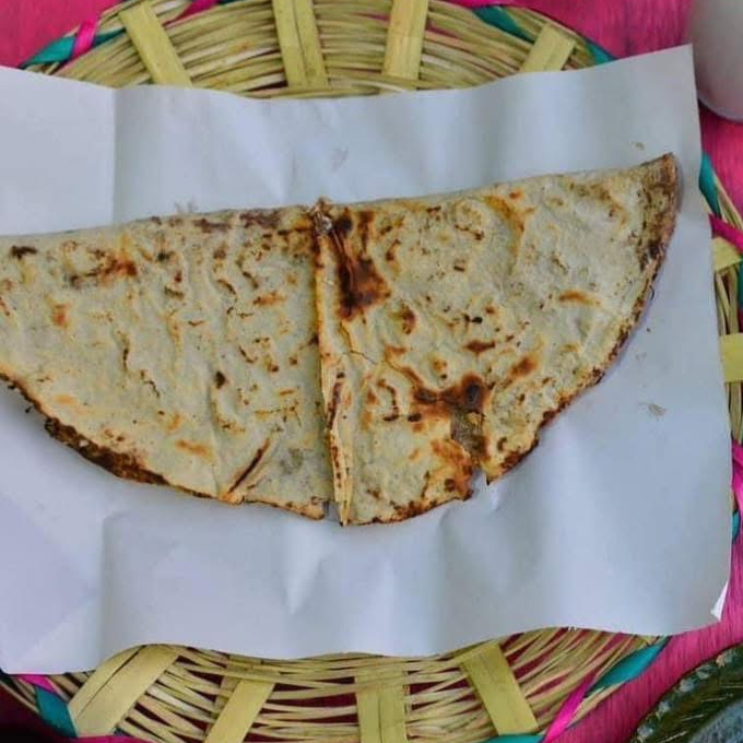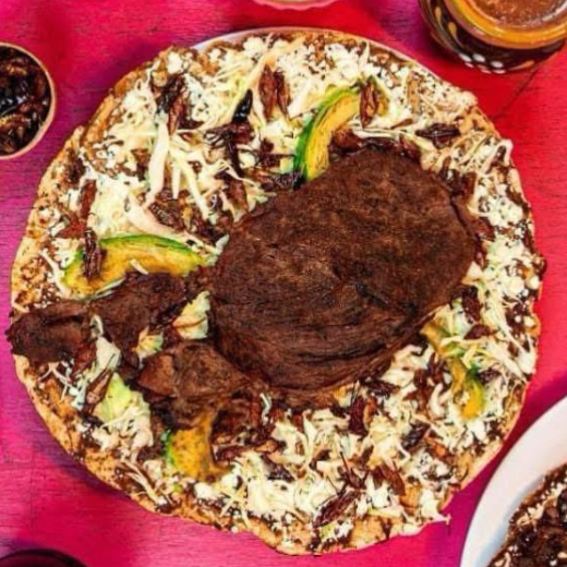 Tlayuda con cecina y chapulines, asiento, frijol, quesillo, repollo y aguacate, con auténtico sabor oaxaqueño.