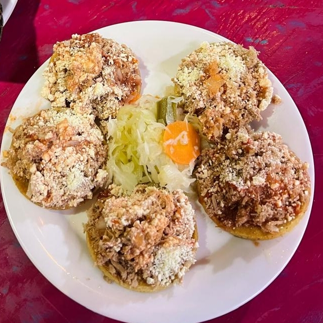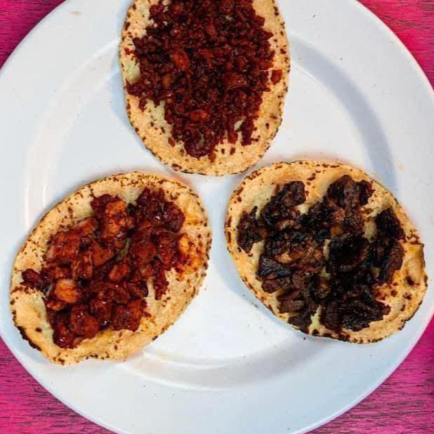 Tortilla de maíz dorada con asiento, frijol, quesillo, carne asada jugosa, repollo y aguacate.