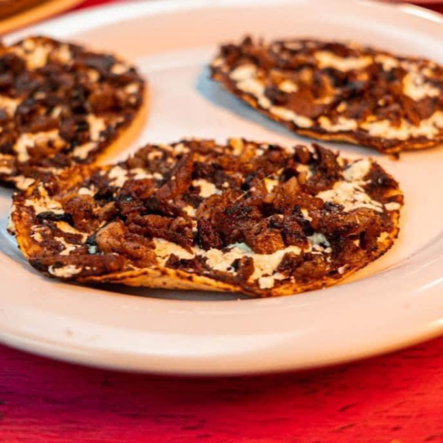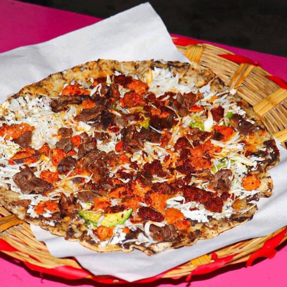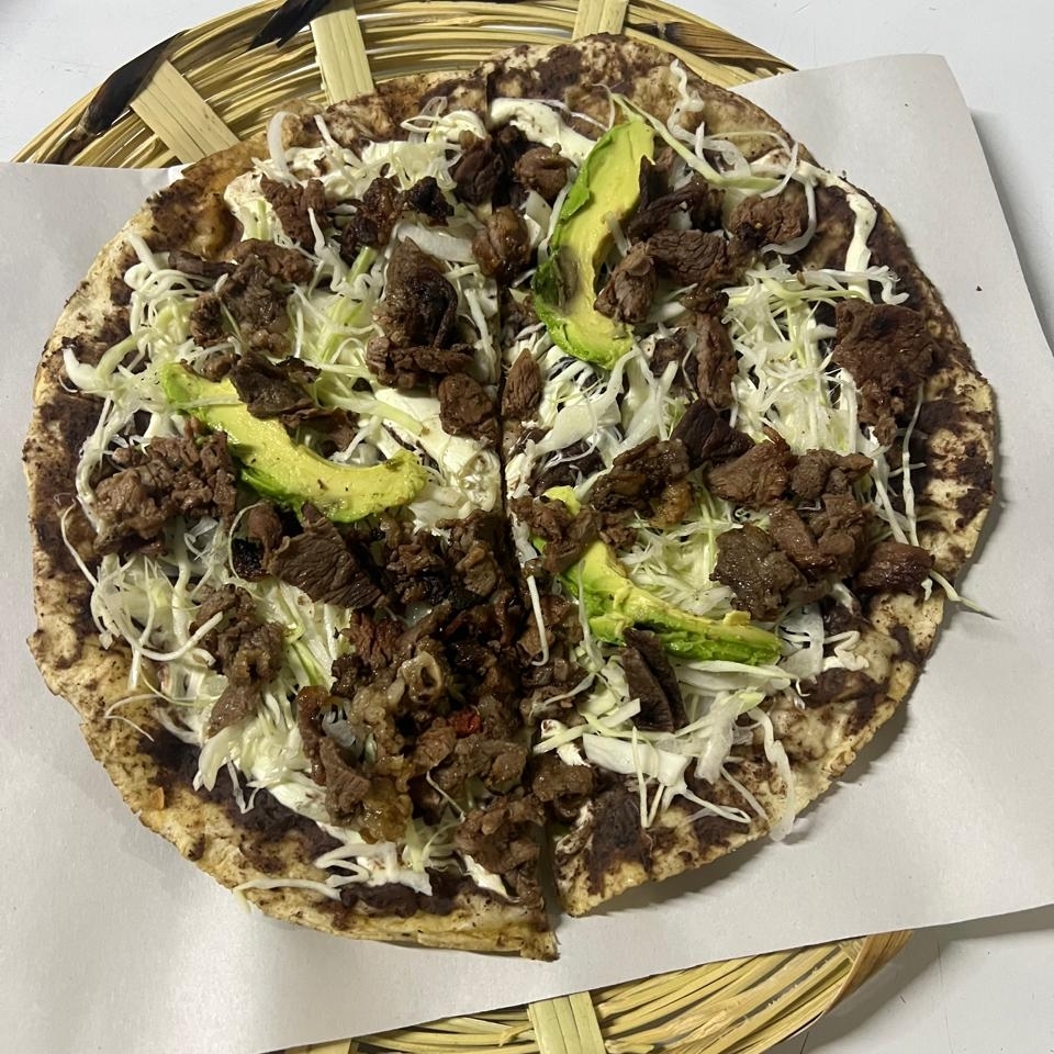 Combinación de carnes asada, enchilada y chorizo, sobre tlayuda crujiente con asiento, frijol, quesillo, repollo y aguacate.