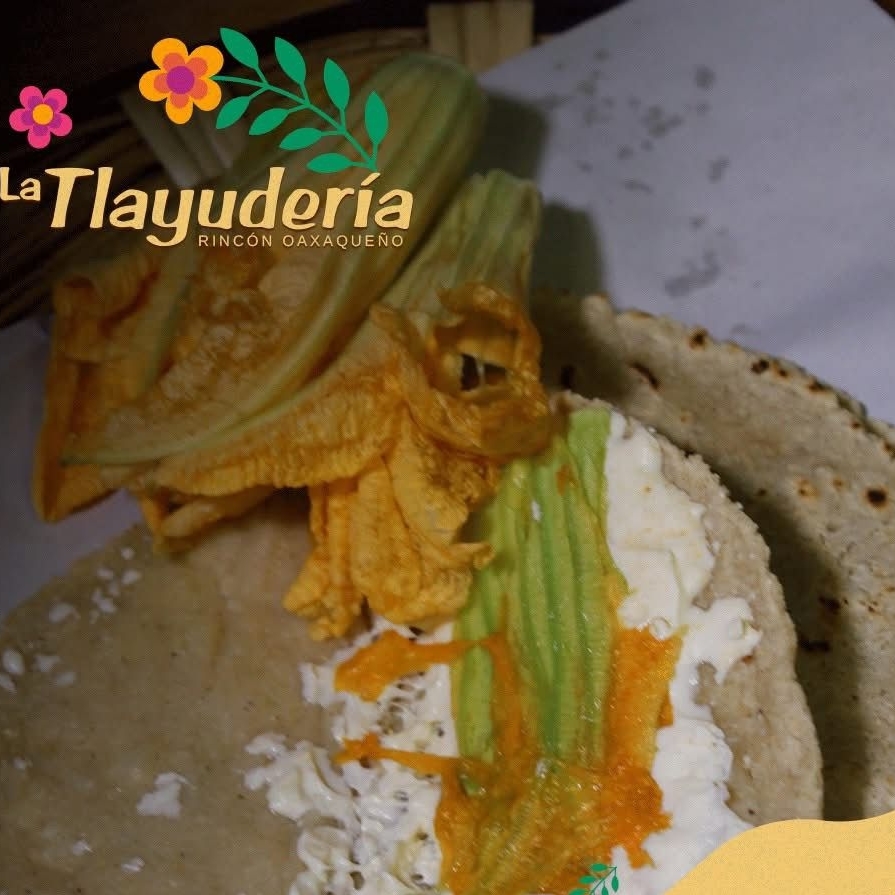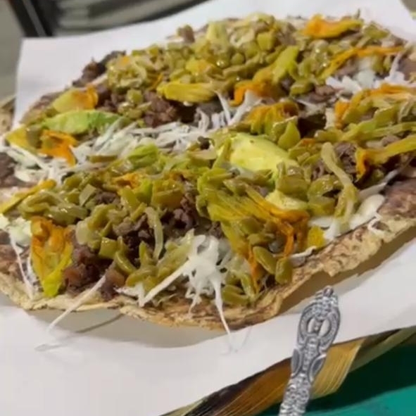 Tlayuda crujiente de flor de calabaza fresca con asiento, frijol, quesillo, repollo y aguacate.