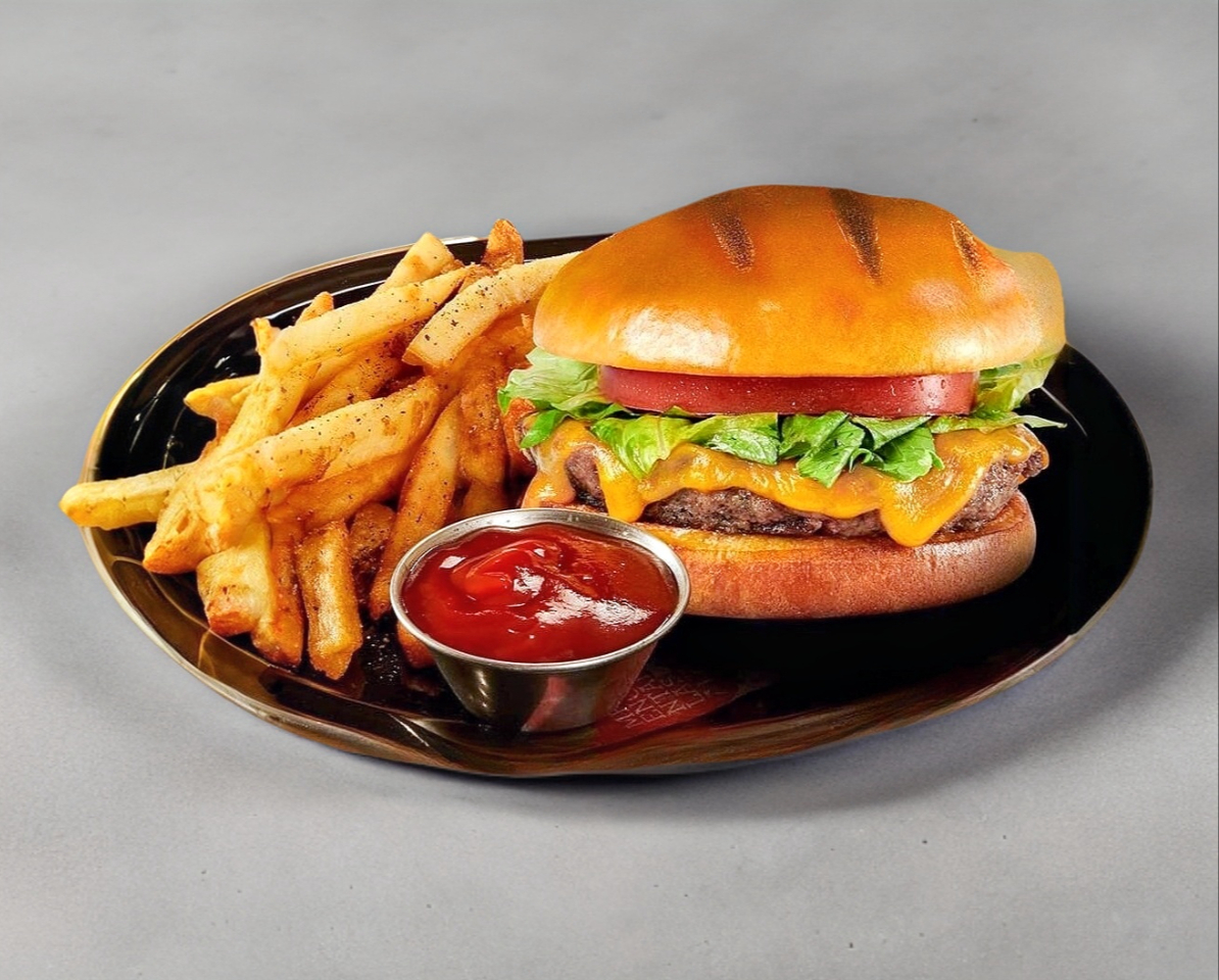 Nuestra hamburguesa clásica preparada con jugosa y ahumada carne de res (200 g) condimentada con una mezcla secreta de especias, queso cheddar derretido, lechuga y jitomate sobre pan brioche con mantequilla.