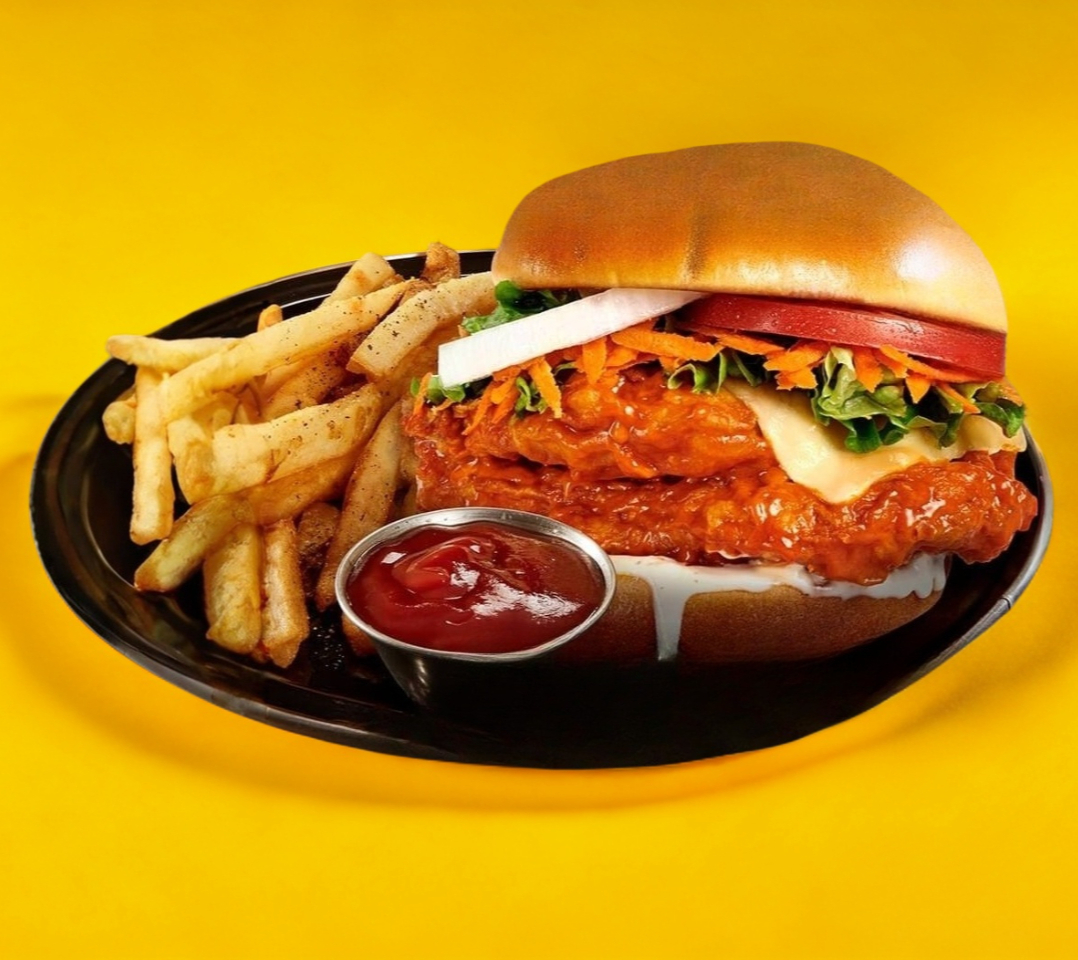 ¡Nuestro más grandioso sándwich! Crujiente pechuga de pollo (230 g) empanizada y bañada en nuestra salsa Original, con queso manchego, lechuga, tomate, cebolla, zanahoria rallada y aderezo Blue Ranch en pan brioche.