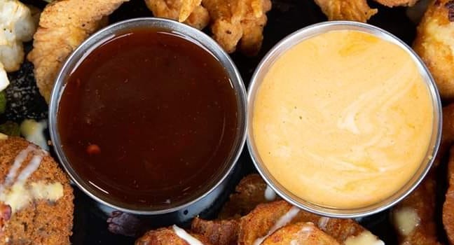 4 ricos jalapeños empanizados bien rellenitos de queso crema, bañados con mucha salsa de queso con cerveza, trocitos de tocino y acompañados con un ramekin de salsa de queso con cerveza.
