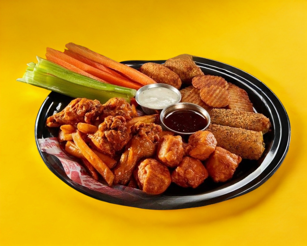 ¡Todo un clásico! Robbys® (2 pz), Cheese Pops (2 pz), Búfalo ruffles (100 g), Chepos® (90 g), nuestras legendarias Alitas (280 g) y jugositos boneless (100 g) bañados en tu salsa favorita. Acompañados de aderezos Dr.Heaven, Blue Cheese y vegetales frescos (120 g).