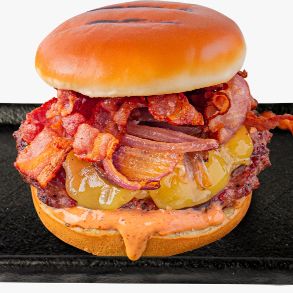 Delicioso tocino doradito, aros de cebolla empanizados, salsa Texas BBQ, queso cheddar derretido sobre una jugosa carne de res (200g) condimentada con nuestra mezcla secreta de especias.
