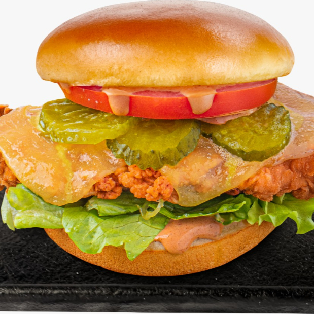 Deliciosa hamburguesa de pechuga de pollo empanizado (110gr), cubierta de queso gouda (20gr) gratinado, con aderezo especial (2oz) en la base del pan, acompañado de lechuga y tomate frescos y pepinillos