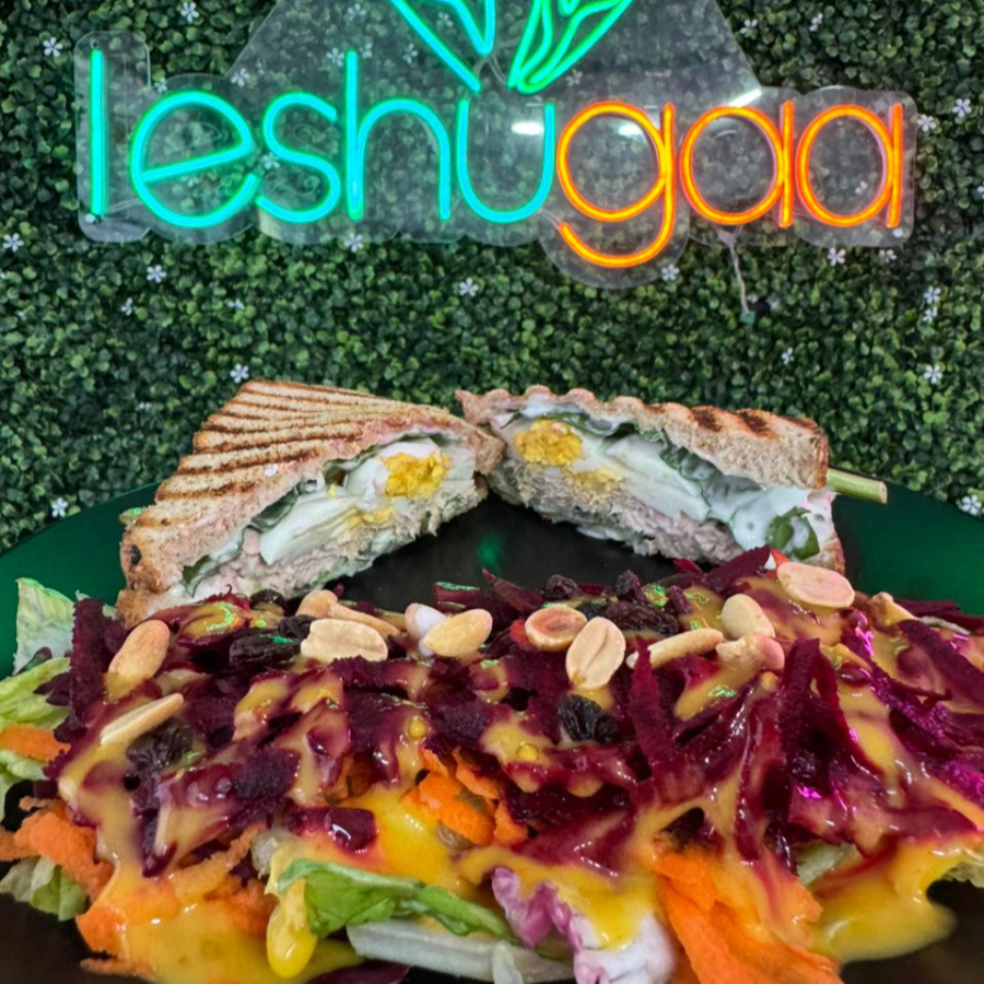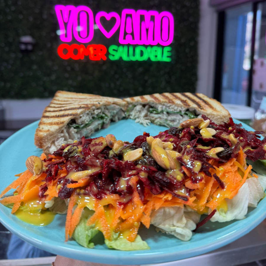Pan masa madre, atún 90 g, queso panela, tómate, cebolla, aguacate, pepino, lechuga, aderezo ranch. Acompañado de ensalada (lechuga, betabel, zanahoria y frutos secos con aderezo mostaza miel).