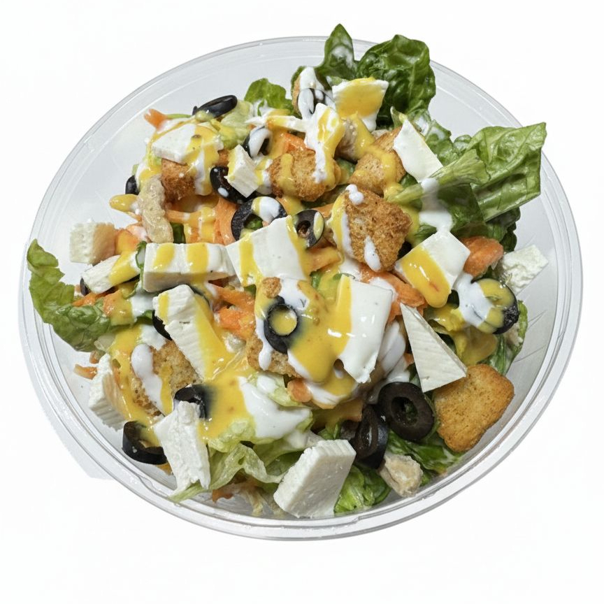 Lechuga, 100 g de queso panela, zanahoria, champiñones, crotones, elotes, aceitunas negras, aderezo mostaza miel y ranch.