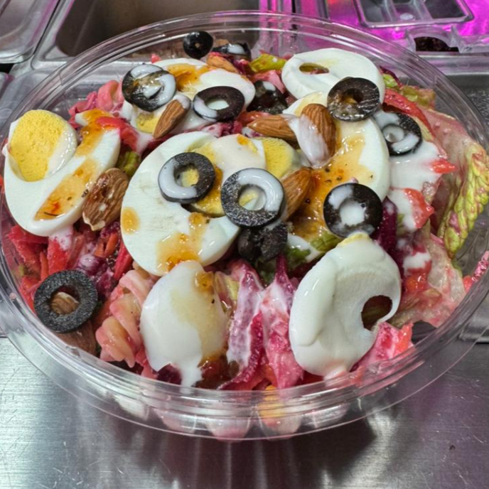 Lechuga, 150 g de pollo, huevo cocido, queso panela, betabel, fusili, zanahoria, elotes, nueces, pasas, aceitunas negras, aderezo ranch e italiano.