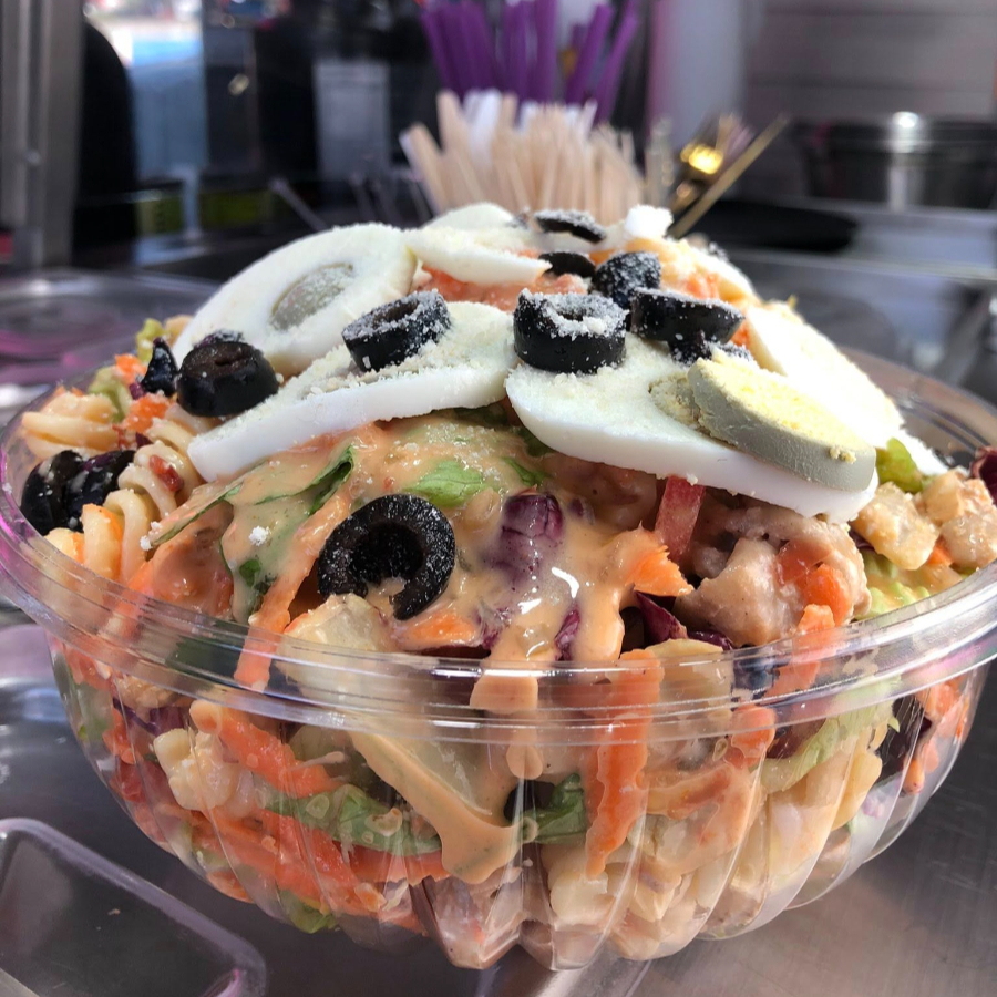 Lechuga, 150 g de pollo, huevo cocido, fusili, elote, zanahoria, tomate, aceitunas negras, cacahuate, aderezo chipotle y queso parmesano.