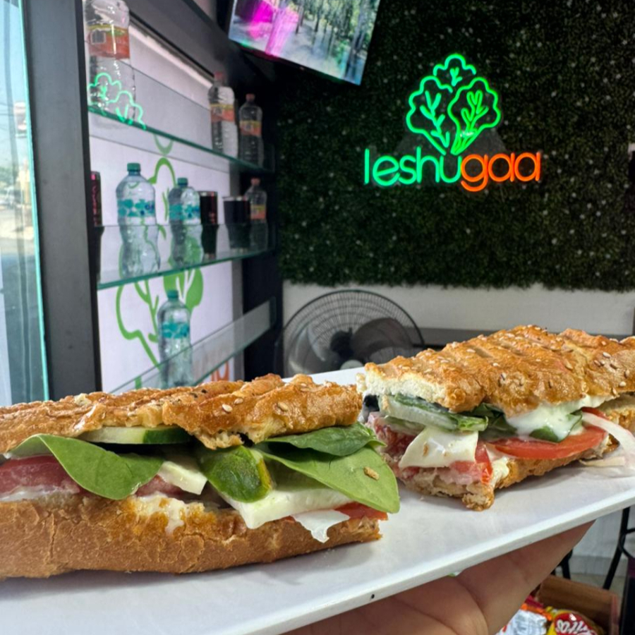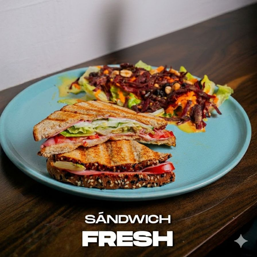 Pan masa madre, jamón, queso panela, tómate, cebolla, aguacate, pepino, lechuga, aderezo ranch. Acompañado de ensalada (lechuga, betabel, zanahoria y frutos secos con aderezo mostaza miel).