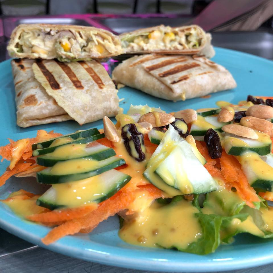 Tortilla de harina light, relleno de atún, elote, lechuga bañado de aderezo.