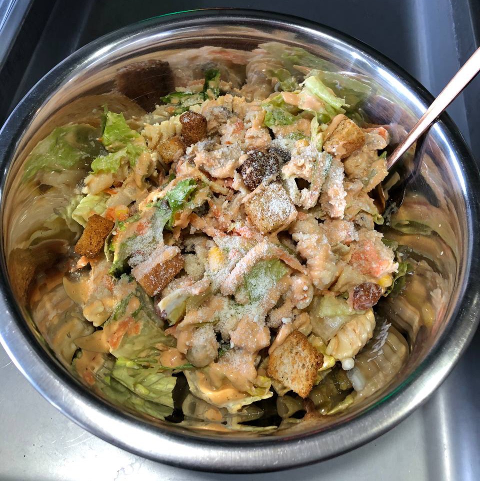 Lechuga, 50 g de surimi, fusili, pepino, zanahoria, elote, aderezo ranch y crotones.