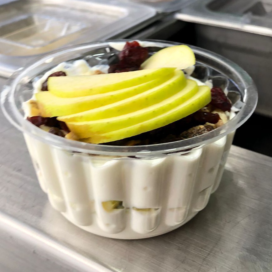 Yogurt griego, granola, mix de nueces, pasas, arándanos, fruta a elegir 355 ml.