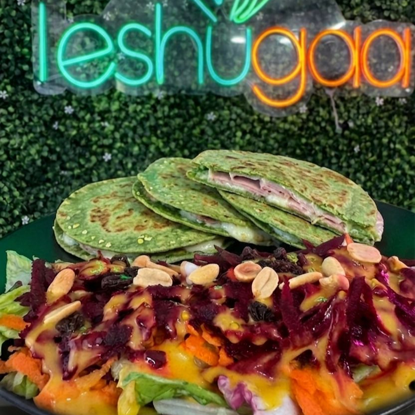 Orden de 3 piezas, tortilla integral de nopal, acompañado de jamón, champiñones y quesillo. Incluye ensalada de zanahoria, betabel y frutos secos con aderezo mostaza miel.