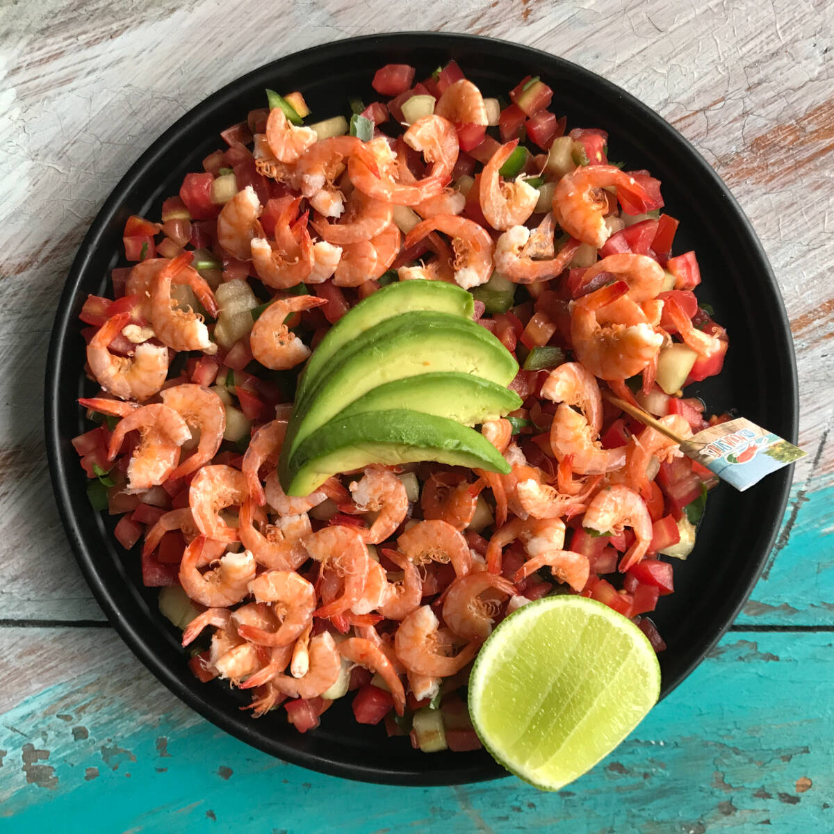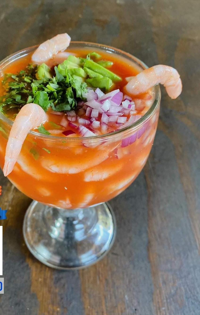 Camarón curtido con limón salsa roja de la casa, acompañados de aguacate.