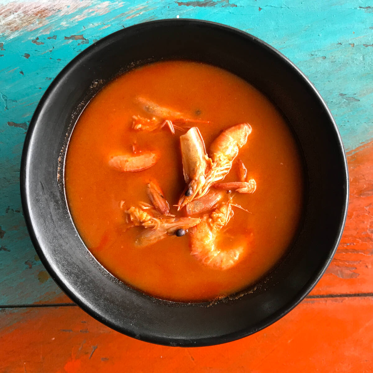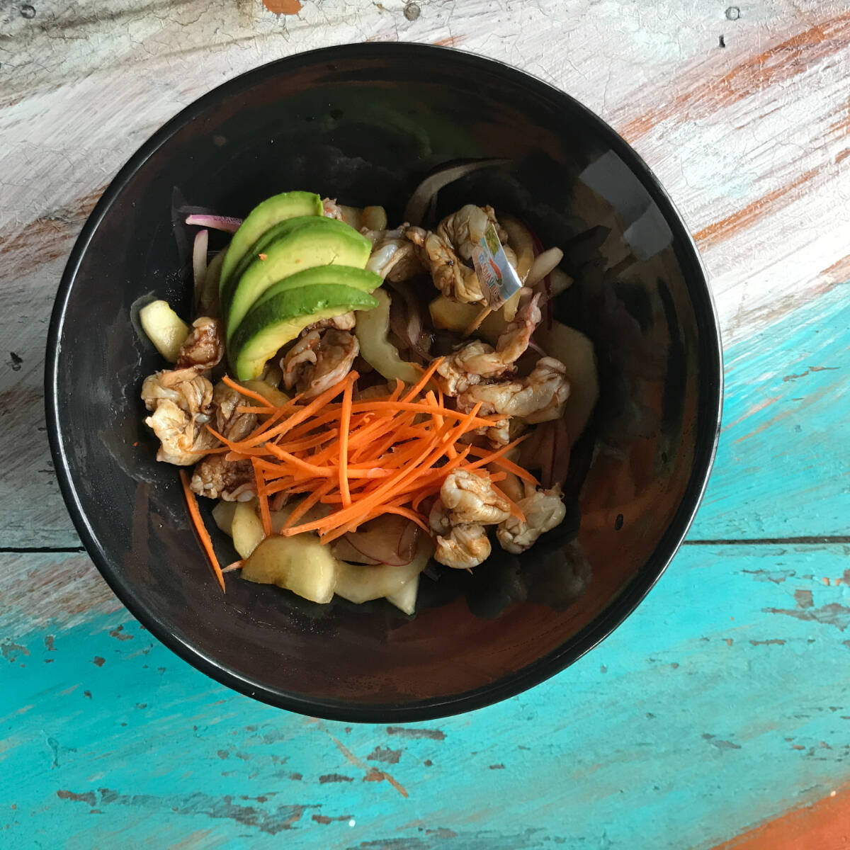Camarón curtido con limón salsa de tamarindo, acompañados de aguacate.