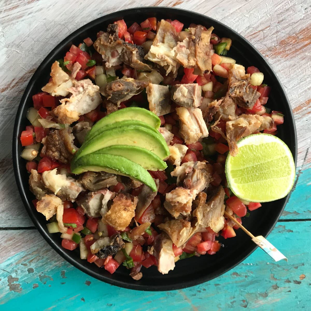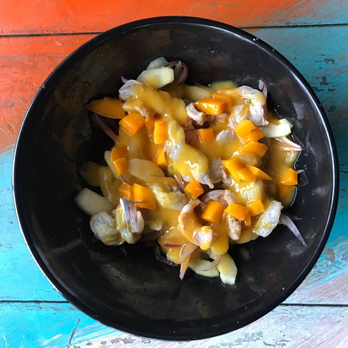 Camarón curtido con limón salsa de mango de la casa, acompañados de aguacate.