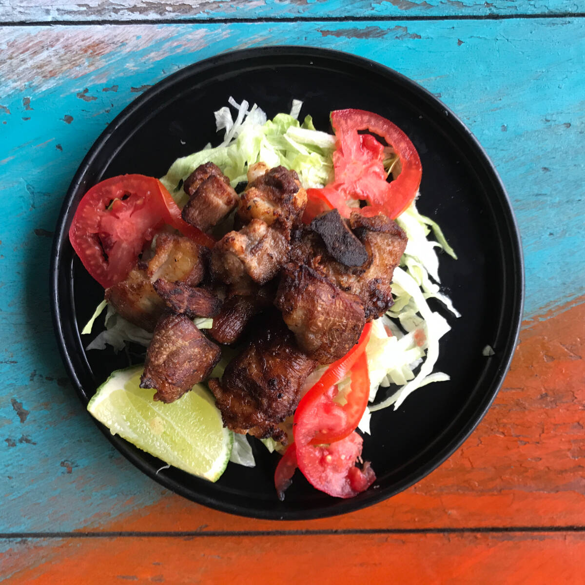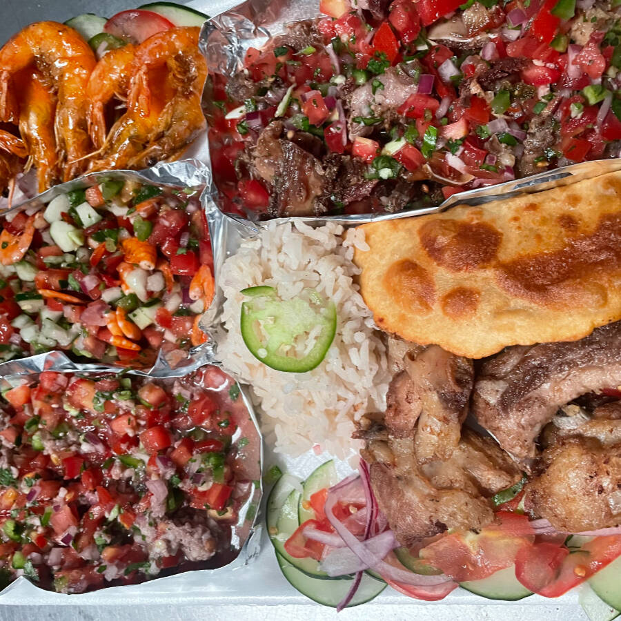 costilla, camarones al ajo, carraca, carne tartara, ensalada camaron seco, empanadas