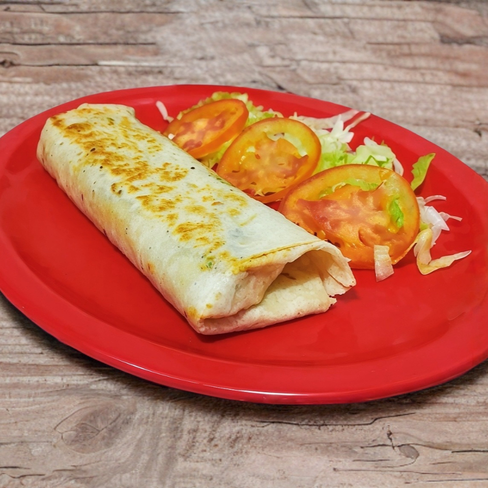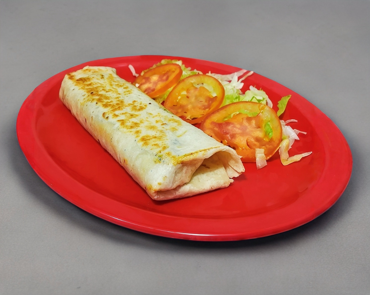 Carne al pastor y quesillo en forma de burrito.