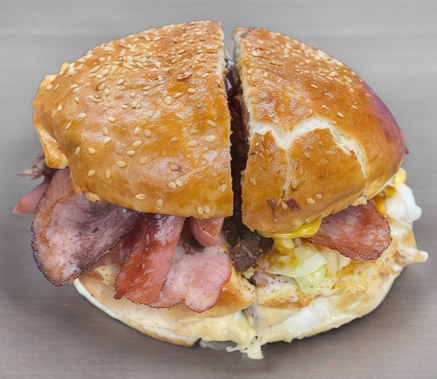 Carne, queso amarillo, jamón, tocino, cheddar, lechuga, tomate y cebolla, incluye aderezo de mayonesa y cátsup.