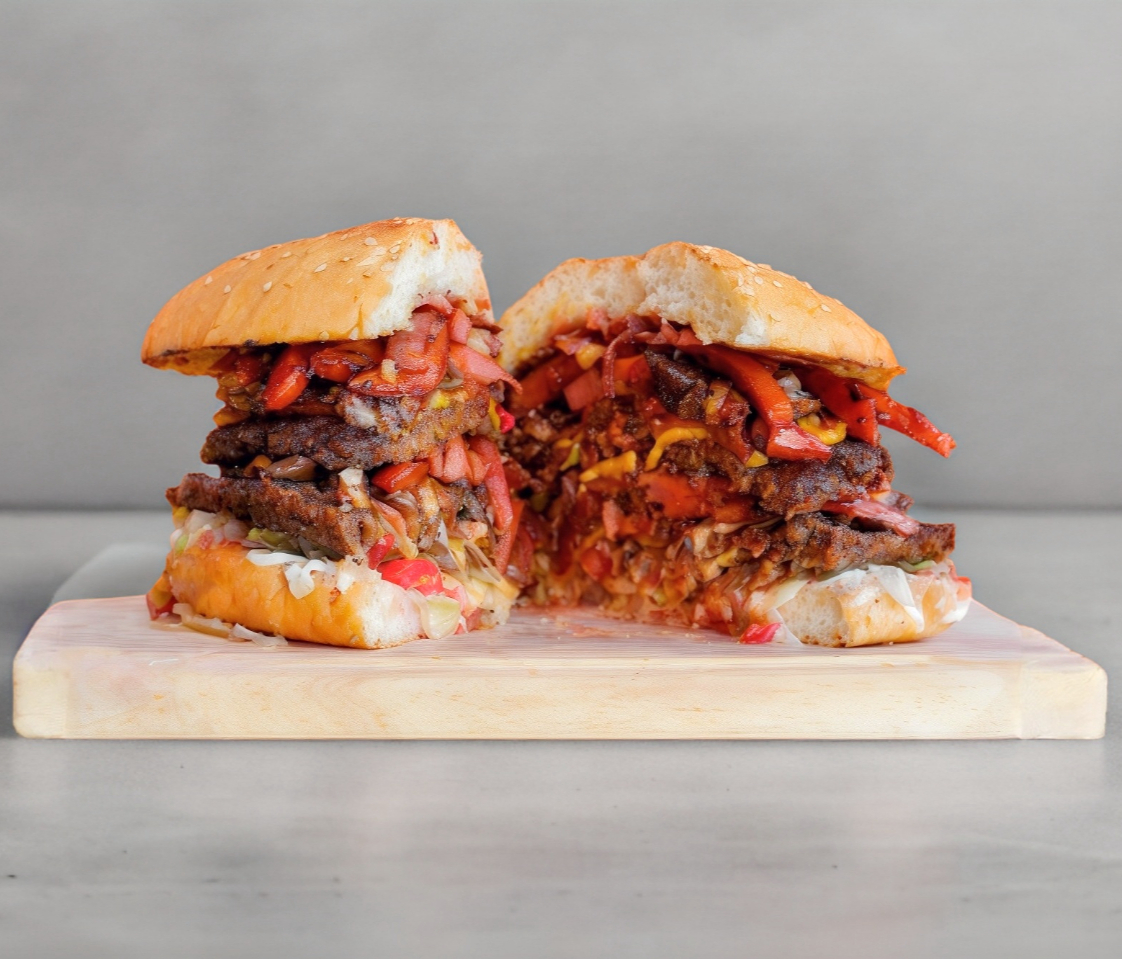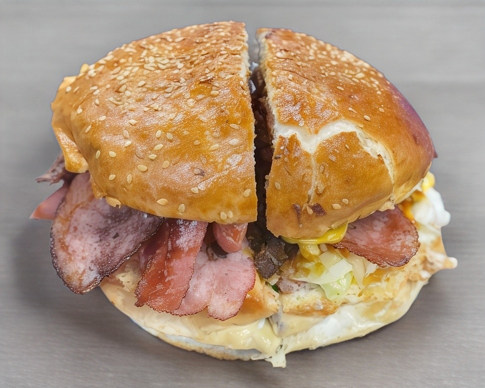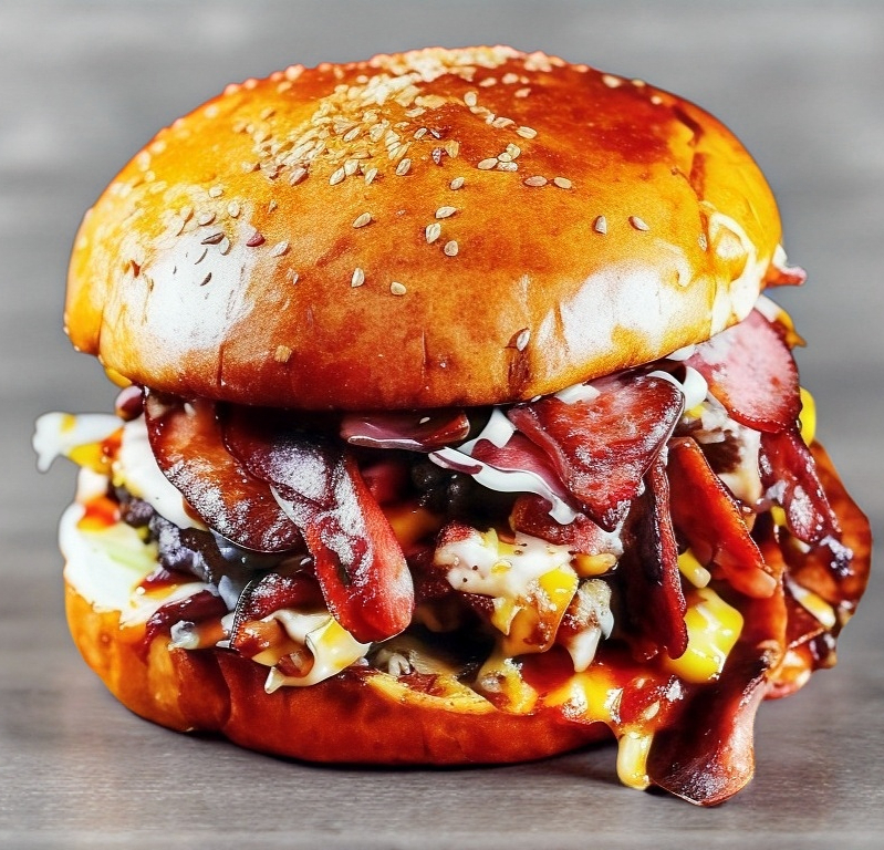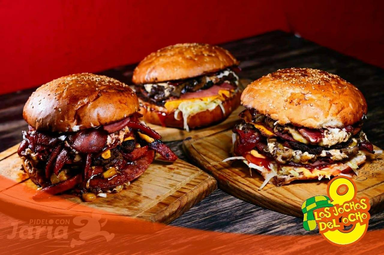 Doble carne, doble queso amarillo, quesillo, manchego, cheddar, doble jamón, doble tocino, arrechera, piña, champiñones, lechuga, tomate y cebolla, incluye aderezo de mayonesa y cátsup.