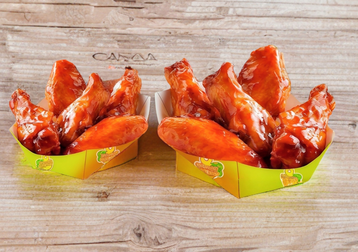 10 Piezas de alitas de pollo bañadas con salsa BBQ.
