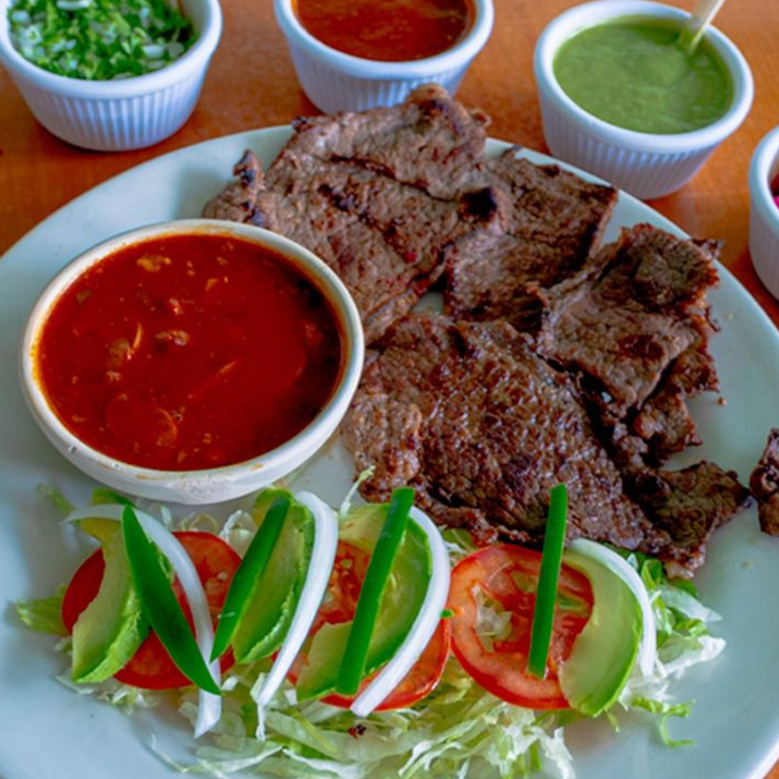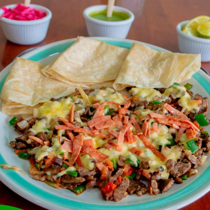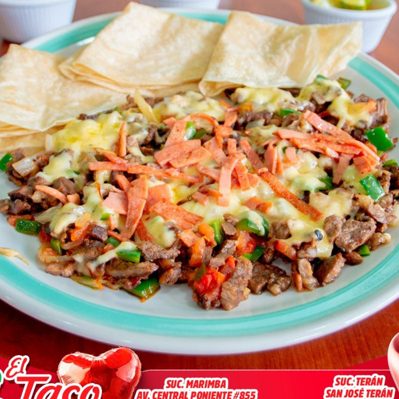 asada tomate cebolla jalapeño tocino queso fundido y tortilla de harina