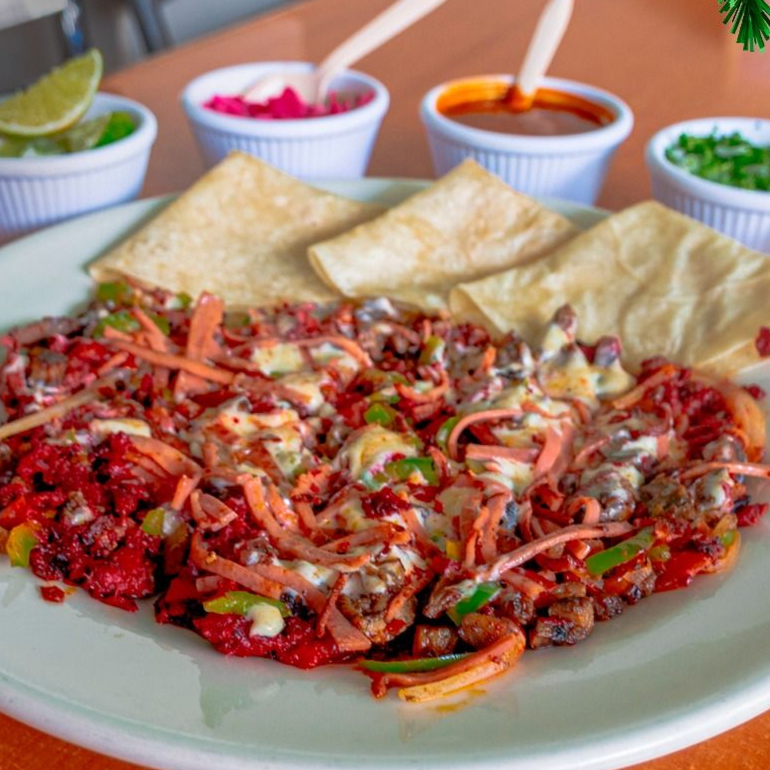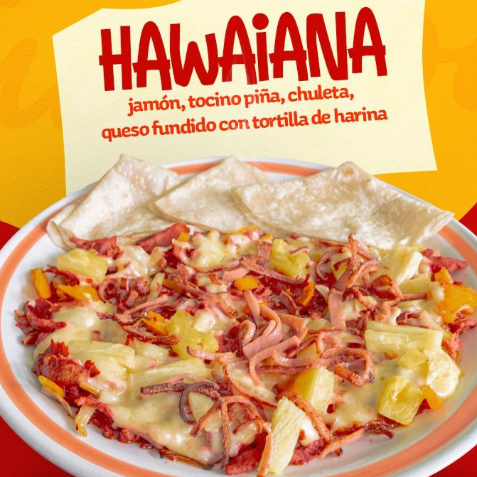 tortilla arabe catsup al pastor queso fundido morron champiñones y piña