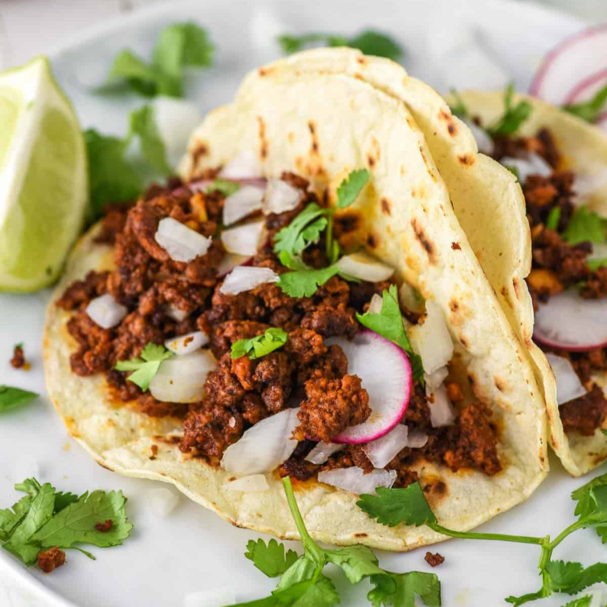 tortilla de maíz y chorizo acompañado de salsa, cebolla y cilantro