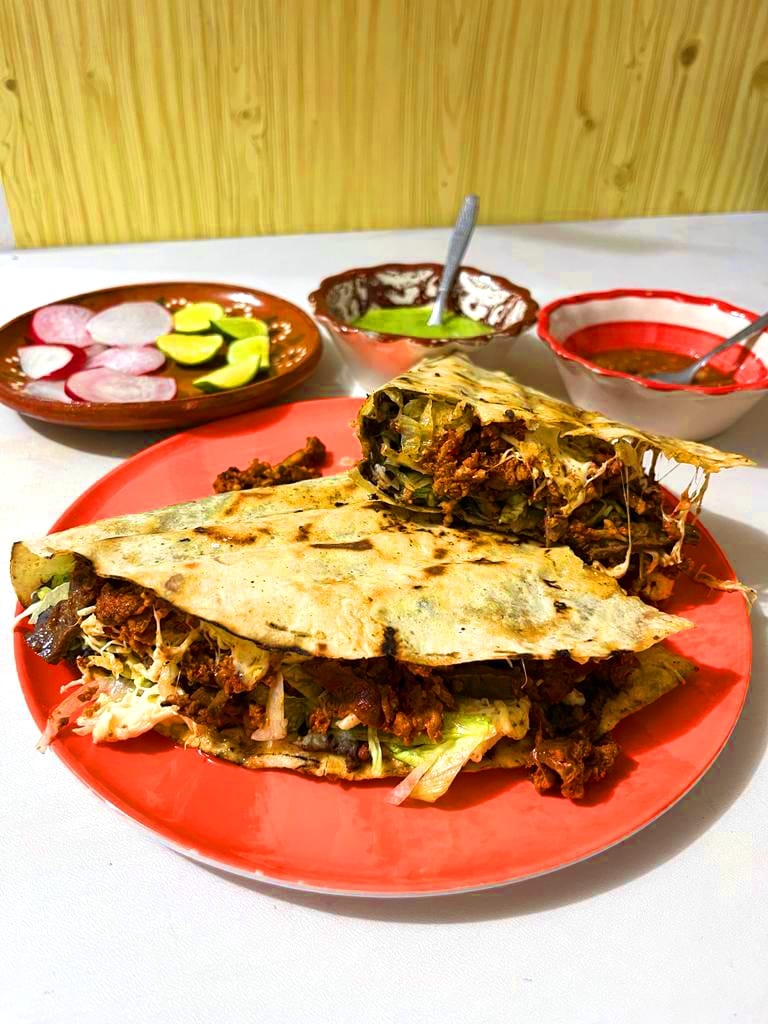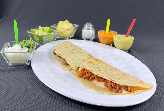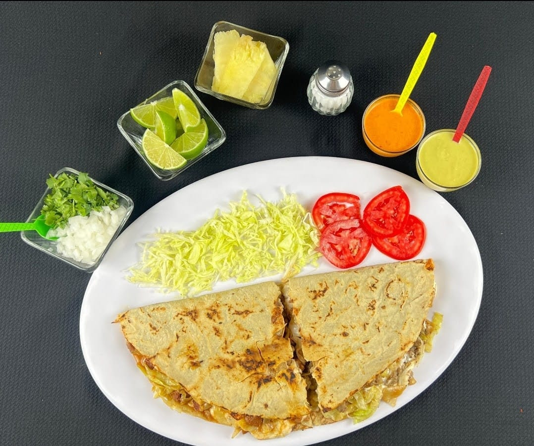 Acompañado de salsa verde y roja, lechuga, cebolla y limones.