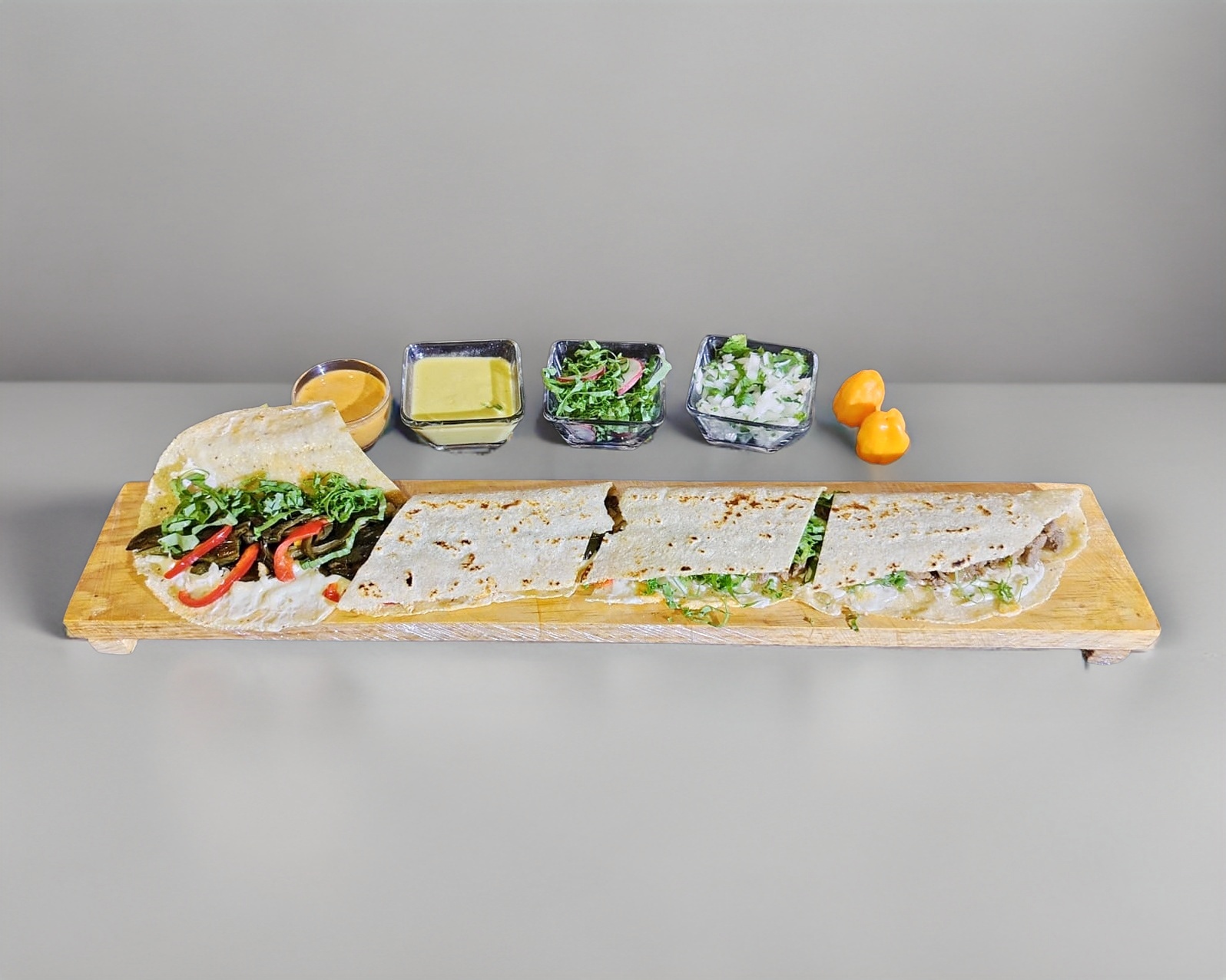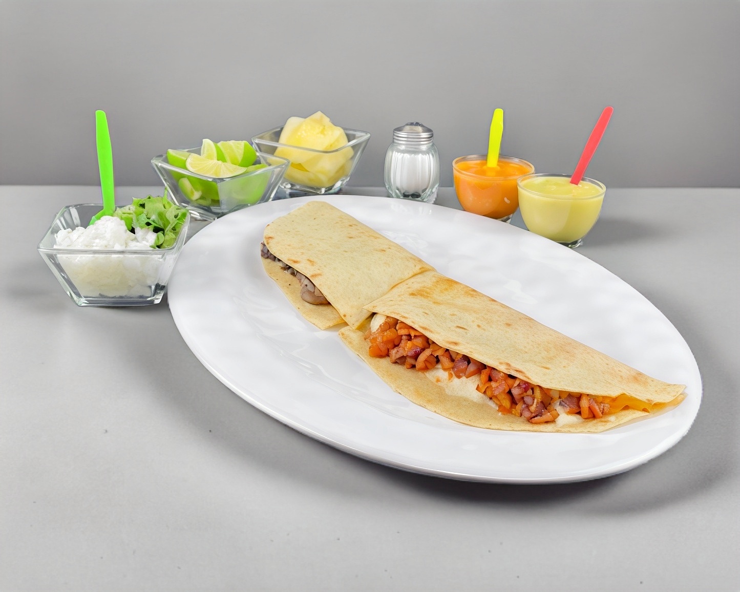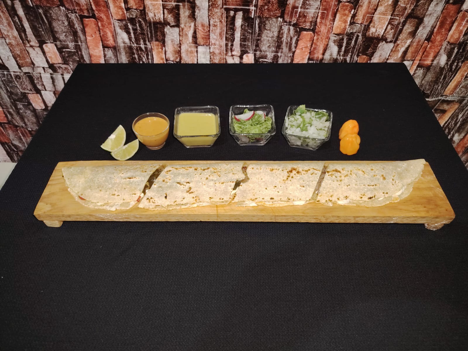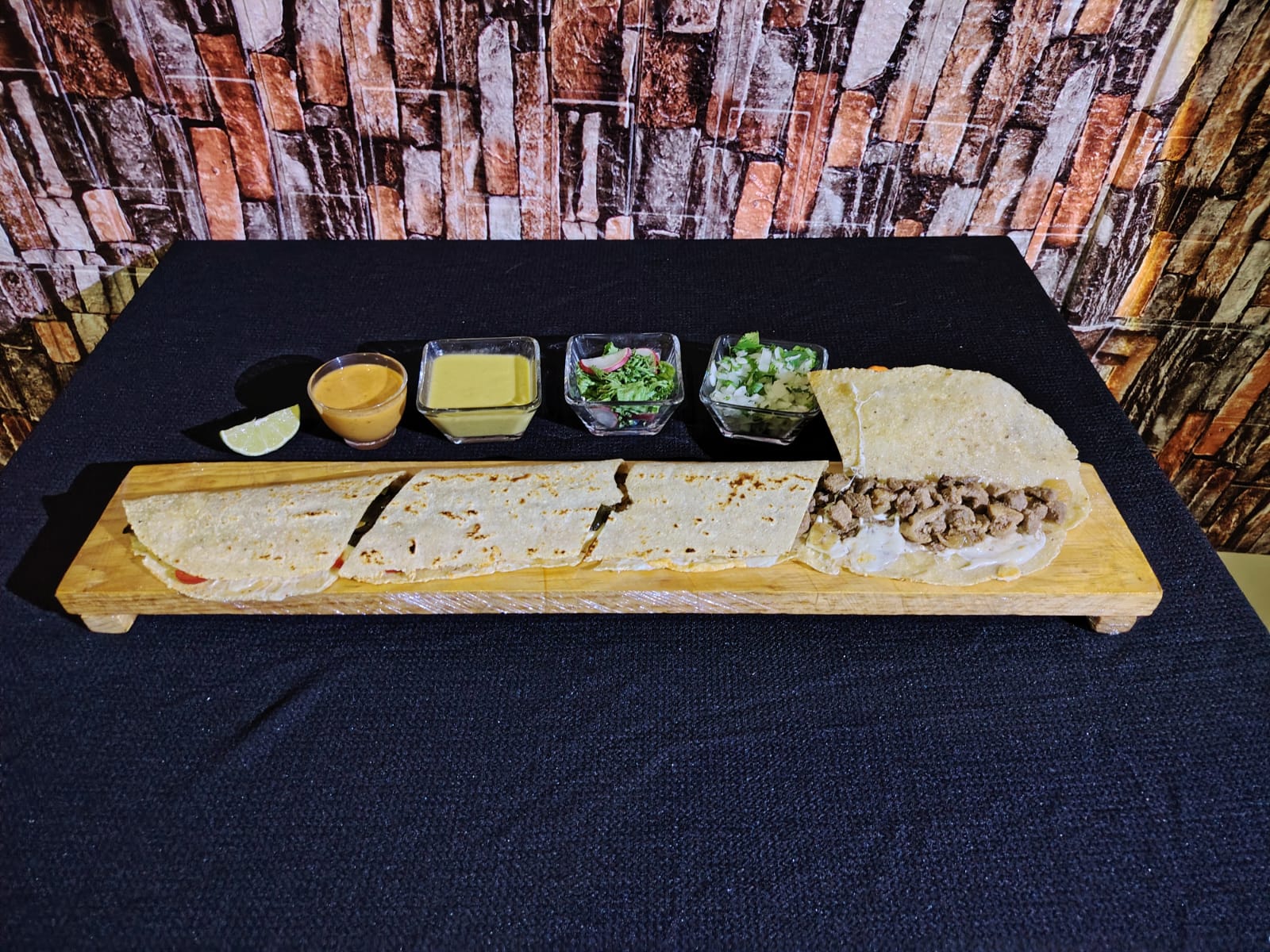 Quesillo fundido ala plancha, elige de nuestra gran variedad el guiso para tu machete de 60 cm, incluye salsas, cebolla picada con cilantro y limones.
