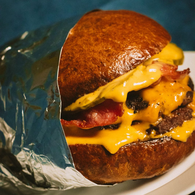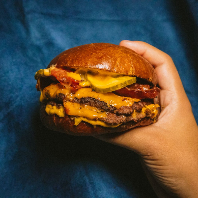 Hamburguesa estilo smash de 100 g con dos tiras de tocino, doble queso, pepinillos y nuestro Aderezo Malcriado. Incluye papas fritas.
