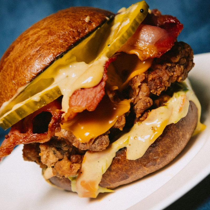 Muslo de pollo frito crujiente, coleslaw fresco, pepinillos y nuestro aderezo especial Chicken Honey (picante y dulce). Incluye papas fritas.